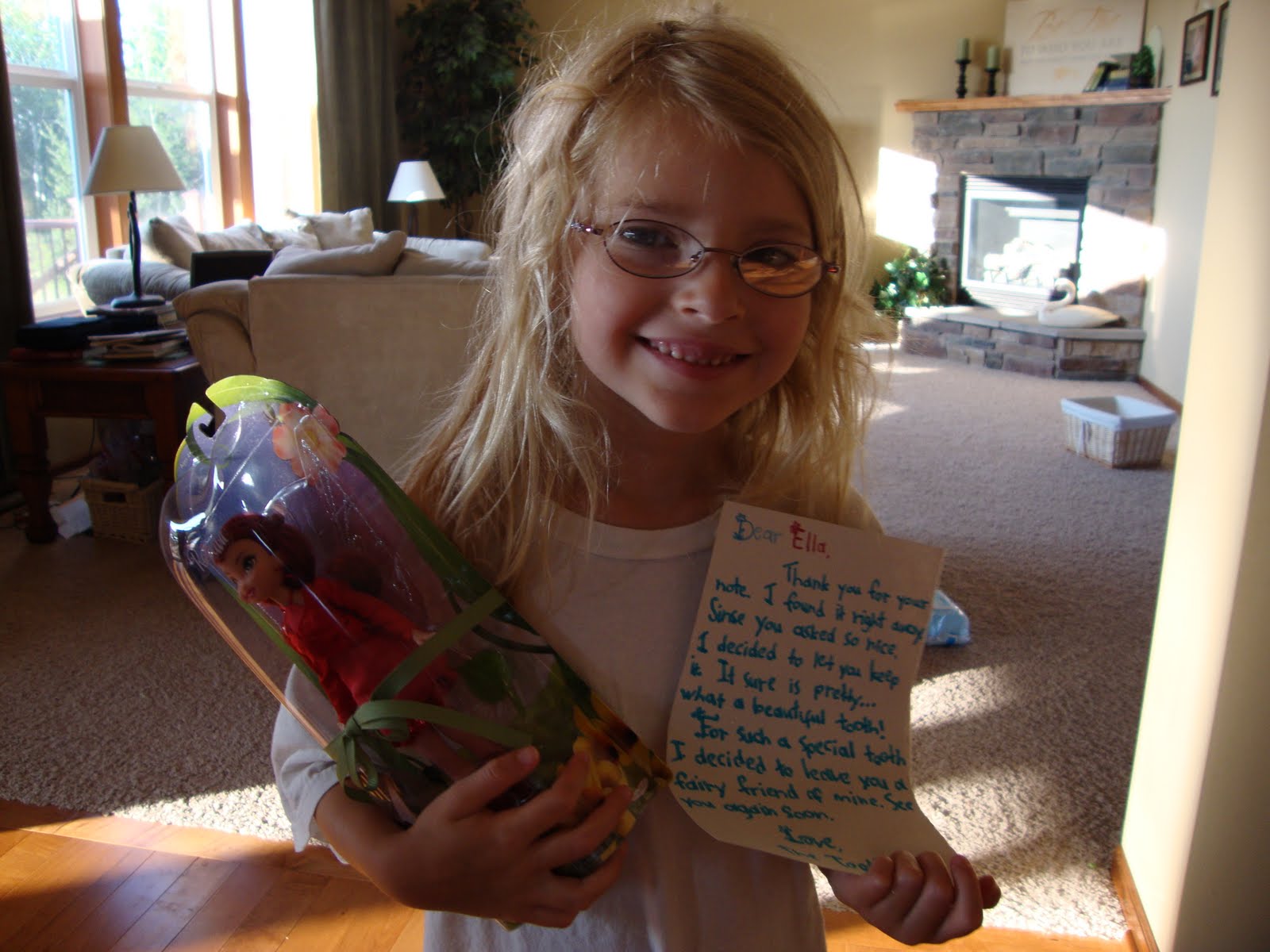 Ella woke up at the crack of dawn and came bounding in my room. She could barely contain herself. The toothfairy...well, as it turns out, is pretty cool. Not only did she leave Ella a present, but she left her the very fairy that she had been wanting for months. And a personal letter to top it off.